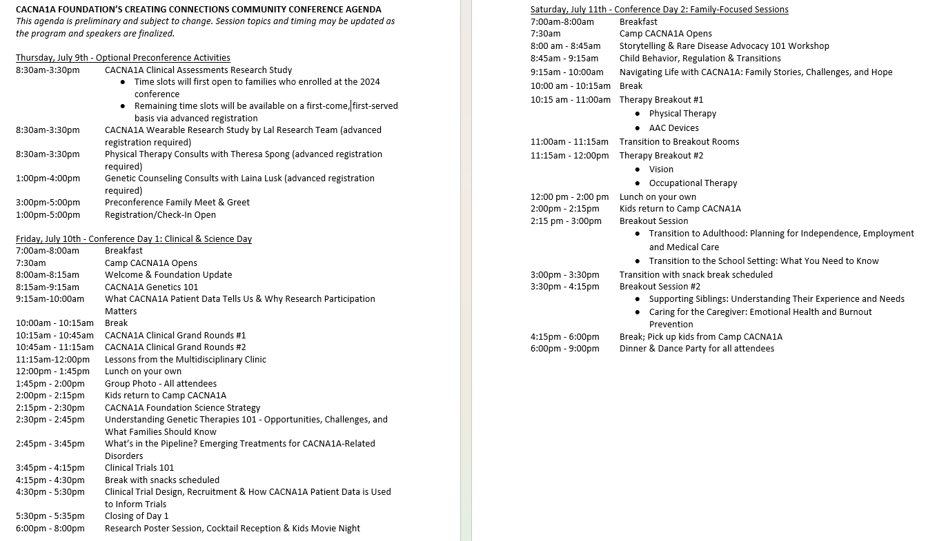 Please note that the actual cost of the conference is approximately $750 per person. Thanks to the generosity of our sponsors and donors, the CACNA1A Foundation can offset a significant portion of this cost, helping make the conference more accessible to families. Please consider being a Friends of the Foundation ($250) or a Family Sponsor ($500) - Add the sponsorship when purchasing your tickets or use Sponsor our Event Button to learn more (scroll to the bottom on the right hand side). We are so grateful for your support!